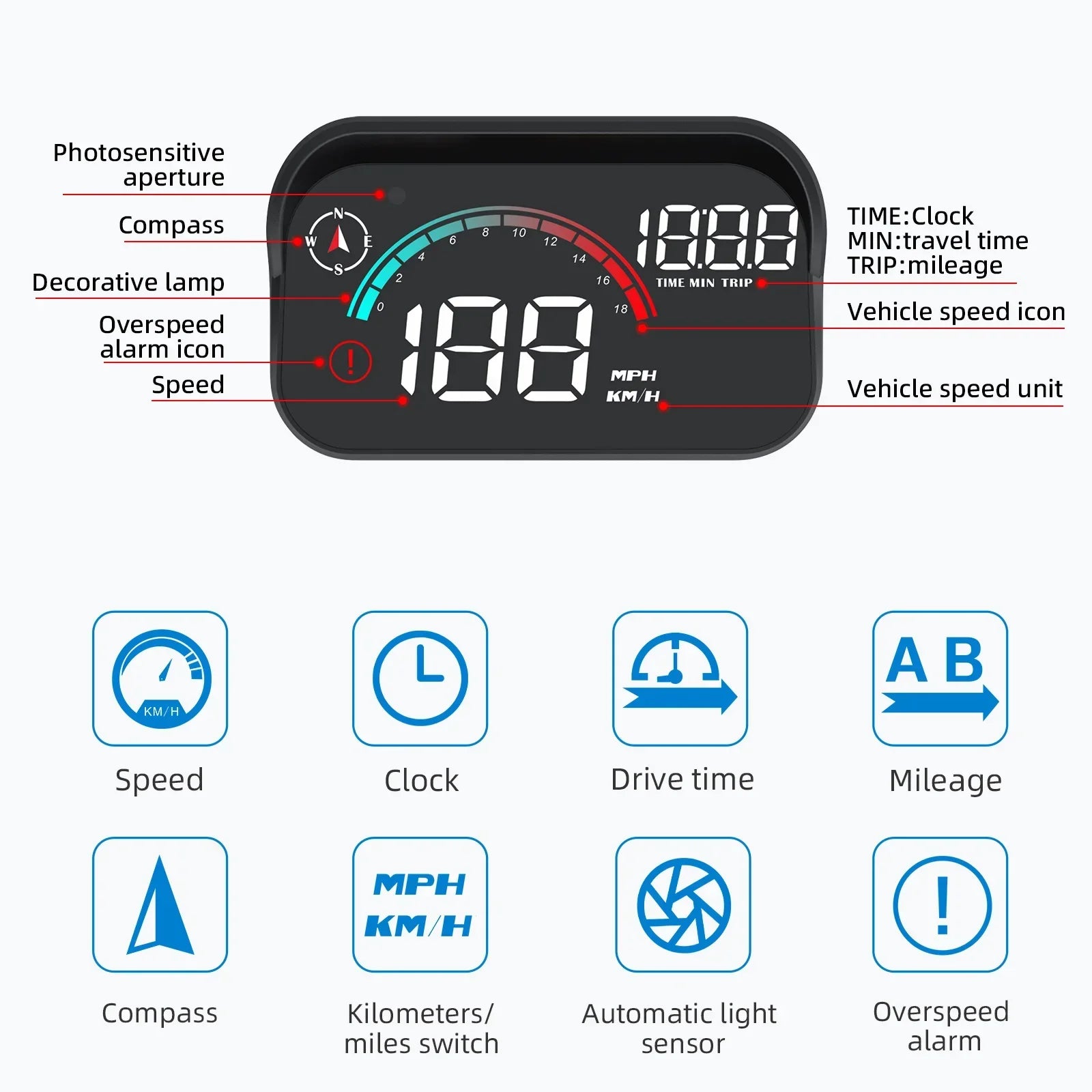 Displays speed in KM/H or MPH with large, easy-to-read fonts